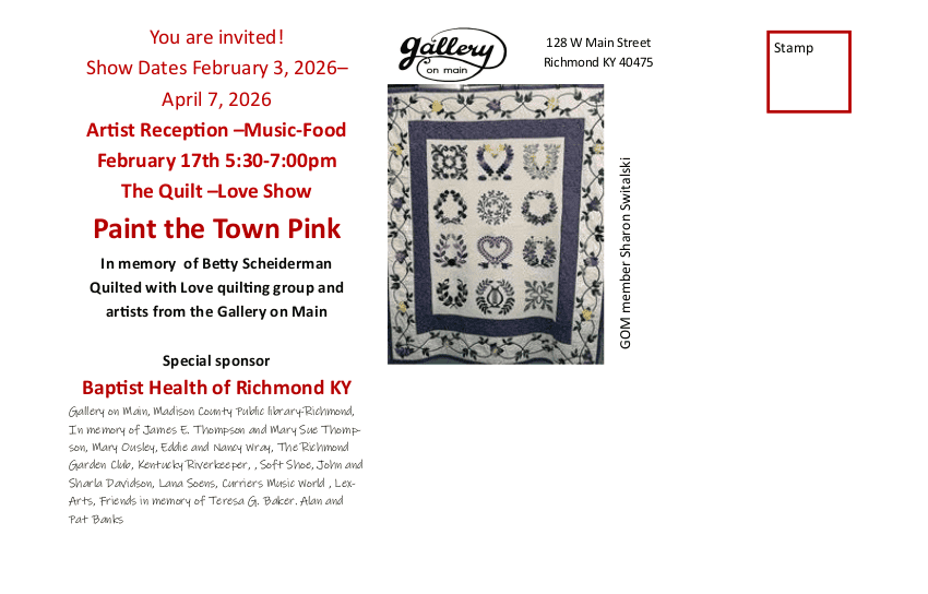 The Quilt –Love Show Artist Reception Gallery The Quilt –Love Show Artist Reception The Quilt –Love Show Artist Reception This art reception will feature quilts in memory of Betty [...] The Quilt –Love Show Artist Reception@la18adminSB2026-02-03T11:48:55-05:00